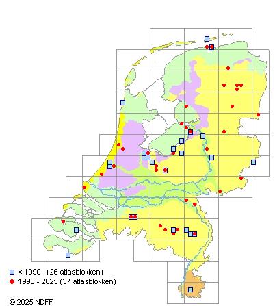 Het aantal atlasblokken (5x5 km) waarin de soort is gemeld binnen een periode van vijf jaar (vanaf 1980) of twintig jaar. Niet gecorrigeerd voor waarnemersinspanning en het aantal doorgegeven waarnemingen kan sterk variëren per periode, dus een trend in verspreiding kan hier niet direct uit worden afgelezen. Het opgegeven jaartal is het eerste jaar van de periode. Bron: gevalideerde waarnemingen uit de NDFF.