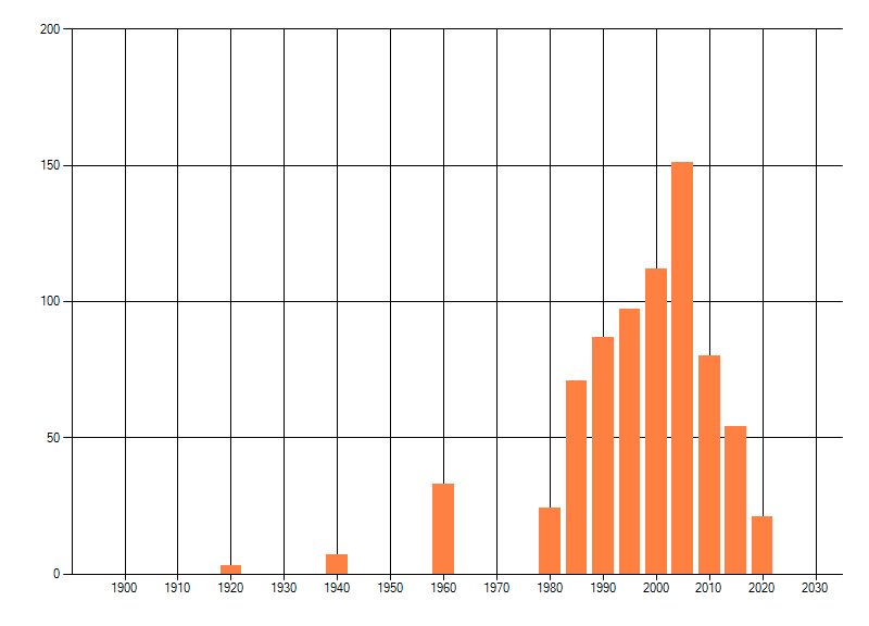 Het aantal atlasblokken (5x5 km) waarin de soort is gemeld binnen een periode van vijf jaar (vanaf 1980) of twintig jaar. Niet gecorrigeerd voor waarnemersinspanning en het aantal doorgegeven waarnemingen kan sterk variëren per periode, dus een trend in verspreiding kan hier niet direct uit worden afgelezen. Het opgegeven jaartal is het eerste jaar van de periode. Bron: gevalideerde waarnemingen uit de NDFF.