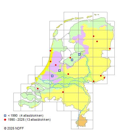 Het aantal atlasblokken (5x5 km) waarin de soort is gemeld binnen een periode van vijf jaar (vanaf 1980) of twintig jaar. Niet gecorrigeerd voor waarnemersinspanning en het aantal doorgegeven waarnemingen kan sterk variëren per periode, dus een trend in verspreiding kan hier niet direct uit worden afgelezen. Het opgegeven jaartal is het eerste jaar van de periode. Bron: gevalideerde waarnemingen uit de NDFF.
