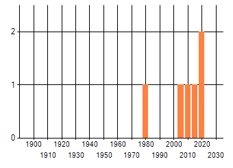 Het aantal atlasblokken (5x5 km) waarin de soort is gemeld binnen een periode van vijf jaar (vanaf 1980) of twintig jaar. Niet gecorrigeerd voor waarnemersinspanning en het aantal doorgegeven waarnemingen kan sterk variëren per periode, dus een trend in verspreiding kan hier niet direct uit worden afgelezen. Het opgegeven jaartal is het eerste jaar van de periode. Bron: gevalideerde waarnemingen uit de NDFF.