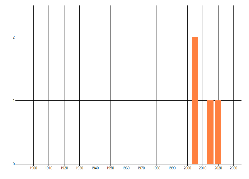 Het aantal atlasblokken (5x5 km) waarin de soort is gemeld binnen een periode van vijf jaar (vanaf 1980) of twintig jaar. Niet gecorrigeerd voor waarnemersinspanning en het aantal doorgegeven waarnemingen kan sterk variëren per periode, dus een trend in verspreiding kan hier niet direct uit worden afgelezen. Het opgegeven jaartal is het eerste jaar van de periode. Bron: gevalideerde waarnemingen uit de NDFF.
