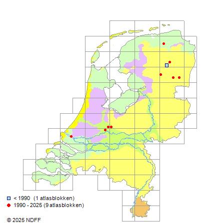 Het aantal atlasblokken (5x5 km) waarin de soort is gemeld binnen een periode van vijf jaar (vanaf 1980) of twintig jaar. Niet gecorrigeerd voor waarnemersinspanning en het aantal doorgegeven waarnemingen kan sterk variëren per periode, dus een trend in verspreiding kan hier niet direct uit worden afgelezen. Het opgegeven jaartal is het eerste jaar van de periode. Bron: gevalideerde waarnemingen uit de NDFF.