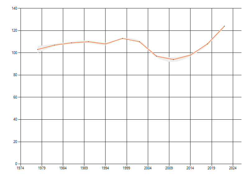 Gemiddelde trend van het aantal kilometerhokken waarin de soort voorkomt, weergegeven als indexcijfer (1975-1978 = 100).