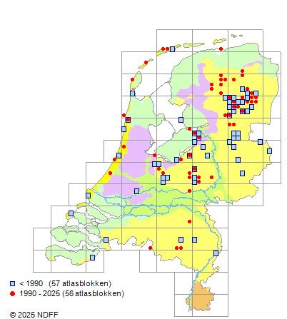 Het aantal atlasblokken (5x5 km) waarin de soort is gemeld binnen een periode van vijf jaar (vanaf 1980) of twintig jaar. Niet gecorrigeerd voor waarnemersinspanning en het aantal doorgegeven waarnemingen kan sterk variëren per periode, dus een trend in verspreiding kan hier niet direct uit worden afgelezen. Het opgegeven jaartal is het eerste jaar van de periode. Bron: gevalideerde waarnemingen uit de NDFF.