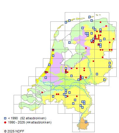 Het aantal atlasblokken (5x5 km) waarin de soort is gemeld binnen een periode van vijf jaar (vanaf 1980) of twintig jaar. Niet gecorrigeerd voor waarnemersinspanning en het aantal doorgegeven waarnemingen kan sterk variëren per periode, dus een trend in verspreiding kan hier niet direct uit worden afgelezen. Het opgegeven jaartal is het eerste jaar van de periode. Bron: gevalideerde waarnemingen uit de NDFF.