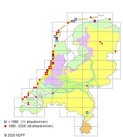 Het aantal atlasblokken (5x5 km) waarin de soort is gemeld binnen een periode van vijf jaar (vanaf 1980) of twintig jaar. Niet gecorrigeerd voor waarnemersinspanning en het aantal doorgegeven waarnemingen kan sterk variëren per periode, dus een trend in verspreiding kan hier niet direct uit worden afgelezen. Het opgegeven jaartal is het eerste jaar van de periode. Bron: gevalideerde waarnemingen uit de NDFF.