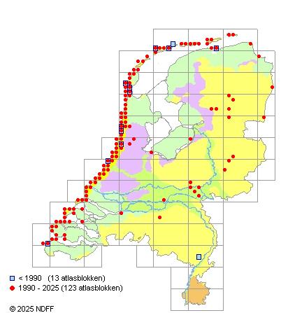 Het aantal atlasblokken (5x5 km) waarin de soort is gemeld binnen een periode van vijf jaar (vanaf 1980) of twintig jaar. Niet gecorrigeerd voor waarnemersinspanning en het aantal doorgegeven waarnemingen kan sterk variëren per periode, dus een trend in verspreiding kan hier niet direct uit worden afgelezen. Het opgegeven jaartal is het eerste jaar van de periode. Bron: gevalideerde waarnemingen uit de NDFF.