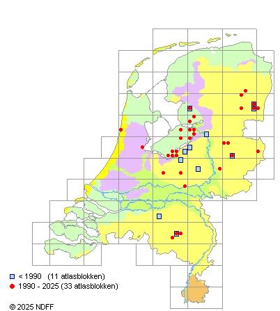 Het aantal atlasblokken (5x5 km) waarin de soort is gemeld binnen een periode van vijf jaar (vanaf 1980) of twintig jaar. Niet gecorrigeerd voor waarnemersinspanning en het aantal doorgegeven waarnemingen kan sterk variëren per periode, dus een trend in verspreiding kan hier niet direct uit worden afgelezen. Het opgegeven jaartal is het eerste jaar van de periode. Bron: gevalideerde waarnemingen uit de NDFF.