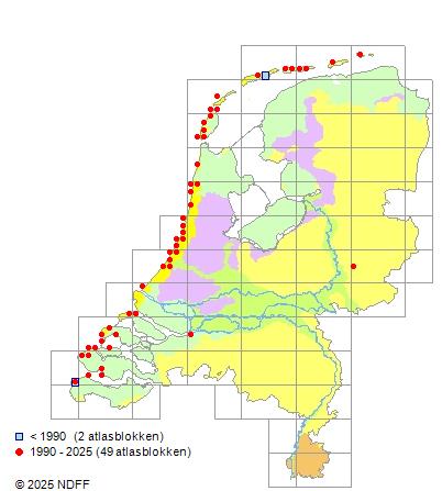 Het aantal atlasblokken (5x5 km) waarin de soort is gemeld binnen een periode van vijf jaar (vanaf 1980) of twintig jaar. Niet gecorrigeerd voor waarnemersinspanning en het aantal doorgegeven waarnemingen kan sterk variëren per periode, dus een trend in verspreiding kan hier niet direct uit worden afgelezen. Het opgegeven jaartal is het eerste jaar van de periode. Bron: gevalideerde waarnemingen uit de NDFF.