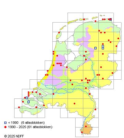 Het aantal atlasblokken (5x5 km) waarin de soort is gemeld binnen een periode van vijf jaar (vanaf 1980) of twintig jaar. Niet gecorrigeerd voor waarnemersinspanning en het aantal doorgegeven waarnemingen kan sterk variëren per periode, dus een trend in verspreiding kan hier niet direct uit worden afgelezen. Het opgegeven jaartal is het eerste jaar van de periode. Bron: gevalideerde waarnemingen uit de NDFF.