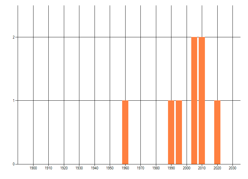 Het aantal atlasblokken (5x5 km) waarin de soort is gemeld binnen een periode van vijf jaar (vanaf 1980) of twintig jaar. Niet gecorrigeerd voor waarnemersinspanning en het aantal doorgegeven waarnemingen kan sterk variëren per periode, dus een trend in verspreiding kan hier niet direct uit worden afgelezen. Het opgegeven jaartal is het eerste jaar van de periode. Bron: gevalideerde waarnemingen uit de NDFF.