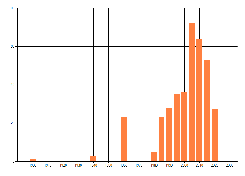 Het aantal atlasblokken (5x5 km) waarin de soort is gemeld binnen een periode van vijf jaar (vanaf 1980) of twintig jaar. Niet gecorrigeerd voor waarnemersinspanning en het aantal doorgegeven waarnemingen kan sterk variëren per periode, dus een trend in verspreiding kan hier niet direct uit worden afgelezen. Het opgegeven jaartal is het eerste jaar van de periode. Bron: gevalideerde waarnemingen uit de NDFF.