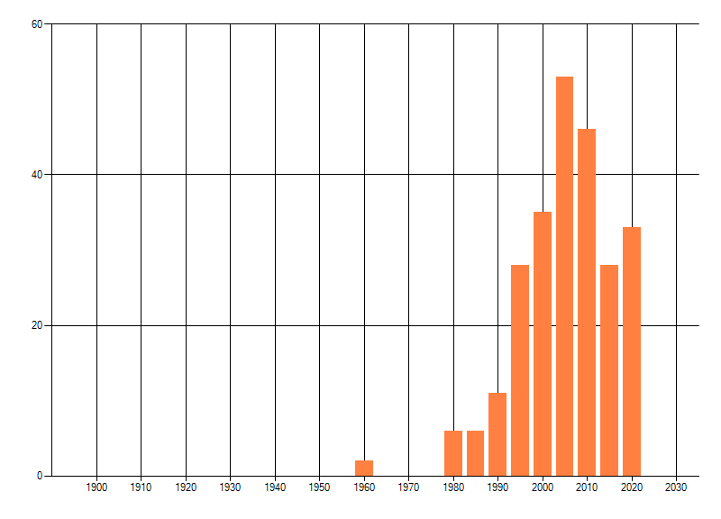 Het aantal atlasblokken (5x5 km) waarin de soort is gemeld binnen een periode van vijf jaar (vanaf 1980) of twintig jaar. Niet gecorrigeerd voor waarnemersinspanning en het aantal doorgegeven waarnemingen kan sterk variëren per periode, dus een trend in verspreiding kan hier niet direct uit worden afgelezen. Het opgegeven jaartal is het eerste jaar van de periode. Bron: gevalideerde waarnemingen uit de NDFF.