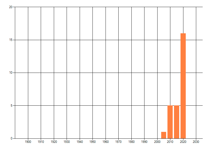 Het aantal atlasblokken (5x5 km) waarin de soort is gemeld binnen een periode van vijf jaar (vanaf 1980) of twintig jaar. Niet gecorrigeerd voor waarnemersinspanning en het aantal doorgegeven waarnemingen kan sterk variëren per periode, dus een trend in verspreiding kan hier niet direct uit worden afgelezen. Het opgegeven jaartal is het eerste jaar van de periode. Bron: gevalideerde waarnemingen uit de NDFF.