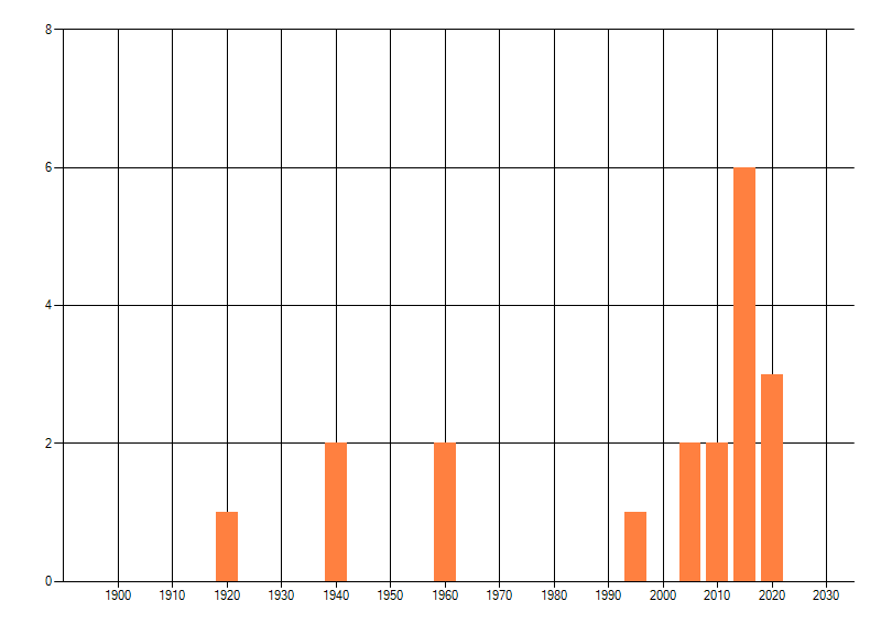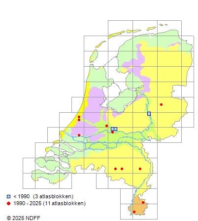 Het aantal atlasblokken (5x5 km) waarin de soort is gemeld binnen een periode van vijf jaar (vanaf 1980) of twintig jaar. Niet gecorrigeerd voor waarnemersinspanning en het aantal doorgegeven waarnemingen kan sterk variëren per periode, dus een trend in verspreiding kan hier niet direct uit worden afgelezen. Het opgegeven jaartal is het eerste jaar van de periode. Bron: gevalideerde waarnemingen uit de NDFF.
