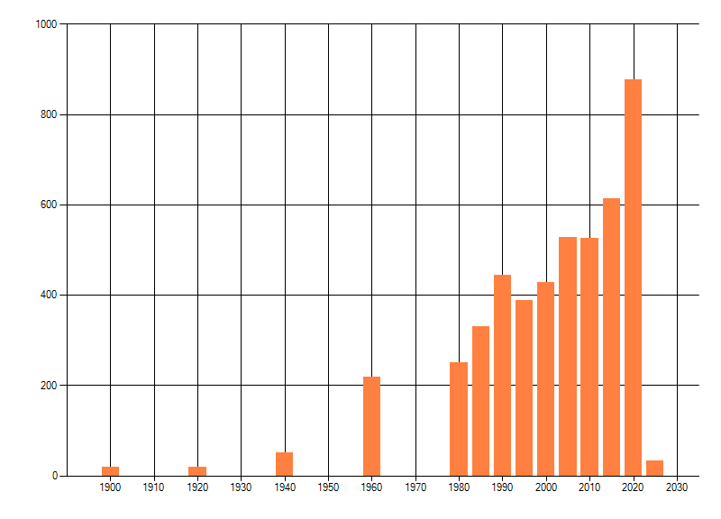 Het aantal atlasblokken (5x5 km) waarin de soort is gemeld binnen een periode van vijf jaar (vanaf 1980) of twintig jaar. Niet gecorrigeerd voor waarnemersinspanning en het aantal doorgegeven waarnemingen kan sterk variëren per periode, dus een trend in verspreiding kan hier niet direct uit worden afgelezen. Het opgegeven jaartal is het eerste jaar van de periode. Bron: gevalideerde waarnemingen uit de NDFF.