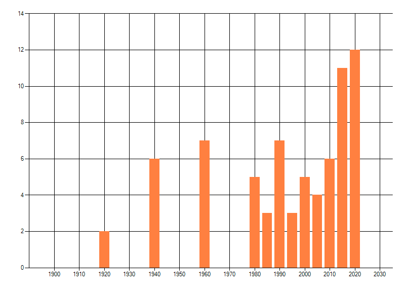 Het aantal atlasblokken (5x5 km) waarin de soort is gemeld binnen een periode van vijf jaar (vanaf 1980) of twintig jaar. Niet gecorrigeerd voor waarnemersinspanning en het aantal doorgegeven waarnemingen kan sterk variëren per periode, dus een trend in verspreiding kan hier niet direct uit worden afgelezen. Het opgegeven jaartal is het eerste jaar van de periode. Bron: gevalideerde waarnemingen uit de NDFF.