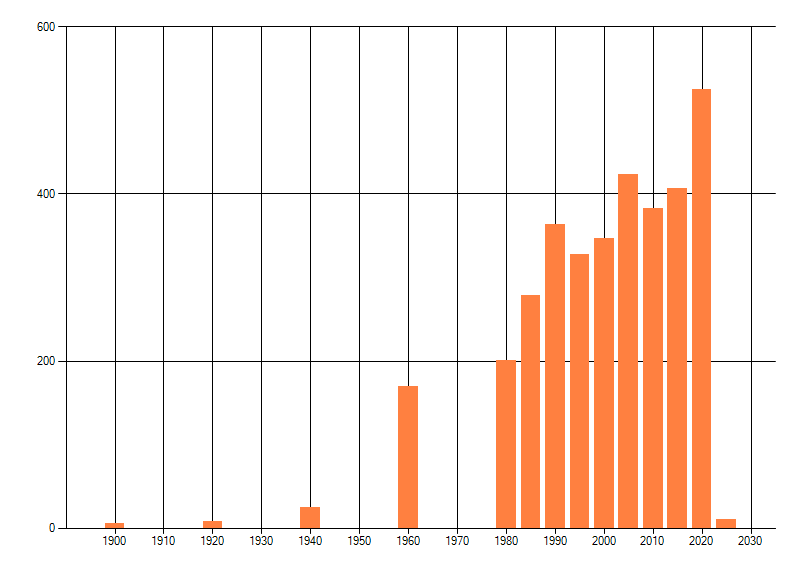 Het aantal atlasblokken (5x5 km) waarin de soort is gemeld binnen een periode van vijf jaar (vanaf 1980) of twintig jaar. Niet gecorrigeerd voor waarnemersinspanning en het aantal doorgegeven waarnemingen kan sterk variëren per periode, dus een trend in verspreiding kan hier niet direct uit worden afgelezen. Het opgegeven jaartal is het eerste jaar van de periode. Bron: gevalideerde waarnemingen uit de NDFF.