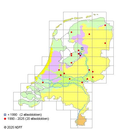 Het aantal atlasblokken (5x5 km) waarin de soort is gemeld binnen een periode van vijf jaar (vanaf 1980) of twintig jaar. Niet gecorrigeerd voor waarnemersinspanning en het aantal doorgegeven waarnemingen kan sterk variëren per periode, dus een trend in verspreiding kan hier niet direct uit worden afgelezen. Het opgegeven jaartal is het eerste jaar van de periode. Bron: gevalideerde waarnemingen uit de NDFF.