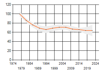 Gemiddelde trend van het aantal kilometerhokken waarin de soort voorkomt, weergegeven als indexcijfer (1975-1978 = 100). De trend is gecorrigeerd voor waarnemersinspanning en geeft de relatieve verandering in het aantal bezette kilometerhokken weer. Voor de berekening worden de data per periode van vier jaar samengenomen. In de grafiek correspondeert ieder punt met het laatste jaar van zo'n periode.