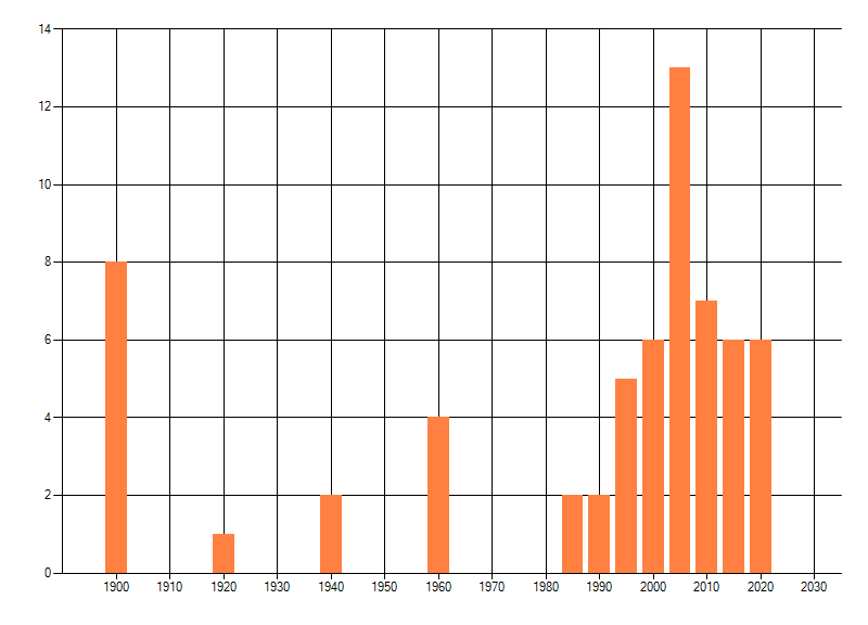 Het aantal atlasblokken (5x5 km) waarin de soort is gemeld binnen een periode van vijf jaar (vanaf 1980) of twintig jaar. Niet gecorrigeerd voor waarnemersinspanning en het aantal doorgegeven waarnemingen kan sterk variëren per periode, dus een trend in verspreiding kan hier niet direct uit worden afgelezen. Het opgegeven jaartal is het eerste jaar van de periode. Bron: gevalideerde waarnemingen uit de NDFF.