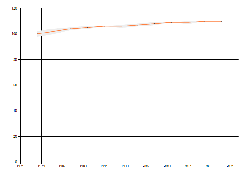 Gemiddelde trend van het aantal kilometerhokken waarin de soort voorkomt, weergegeven als indexcijfer (1975-1978 = 100).