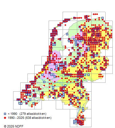 Het aantal atlasblokken (5x5 km) waarin de soort is gemeld binnen een periode van vijf jaar (vanaf 1980) of twintig jaar. Niet gecorrigeerd voor waarnemersinspanning en het aantal doorgegeven waarnemingen kan sterk variëren per periode, dus een trend in verspreiding kan hier niet direct uit worden afgelezen. Het opgegeven jaartal is het eerste jaar van de periode. Bron: gevalideerde waarnemingen uit de NDFF.