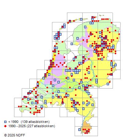 Het aantal atlasblokken (5x5 km) waarin de soort is gemeld binnen een periode van vijf jaar (vanaf 1980) of twintig jaar. Niet gecorrigeerd voor waarnemersinspanning en het aantal doorgegeven waarnemingen kan sterk variëren per periode, dus een trend in verspreiding kan hier niet direct uit worden afgelezen. Het opgegeven jaartal is het eerste jaar van de periode. Bron: gevalideerde waarnemingen uit de NDFF.