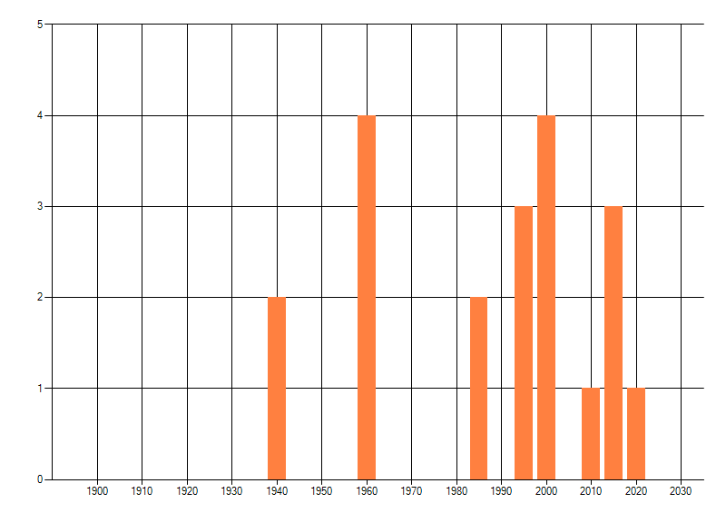 Het aantal atlasblokken (5x5 km) waarin de soort is gemeld binnen een periode van vijf jaar (vanaf 1980) of twintig jaar. Niet gecorrigeerd voor waarnemersinspanning en het aantal doorgegeven waarnemingen kan sterk variëren per periode, dus een trend in verspreiding kan hier niet direct uit worden afgelezen. Het opgegeven jaartal is het eerste jaar van de periode. Bron: gevalideerde waarnemingen uit de NDFF.