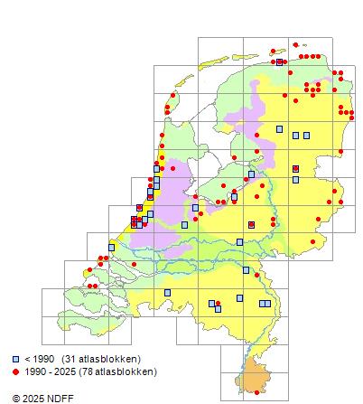 Het aantal atlasblokken (5x5 km) waarin de soort is gemeld binnen een periode van vijf jaar (vanaf 1980) of twintig jaar. Niet gecorrigeerd voor waarnemersinspanning en het aantal doorgegeven waarnemingen kan sterk variëren per periode, dus een trend in verspreiding kan hier niet direct uit worden afgelezen. Het opgegeven jaartal is het eerste jaar van de periode. Bron: gevalideerde waarnemingen uit de NDFF.