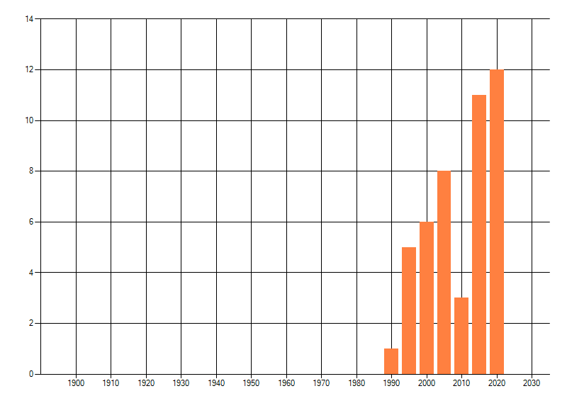 Het aantal atlasblokken (5x5 km) waarin de soort is gemeld binnen een periode van vijf jaar (vanaf 1980) of twintig jaar. Niet gecorrigeerd voor waarnemersinspanning en het aantal doorgegeven waarnemingen kan sterk variëren per periode, dus een trend in verspreiding kan hier niet direct uit worden afgelezen. Het opgegeven jaartal is het eerste jaar van de periode. Bron: gevalideerde waarnemingen uit de NDFF.