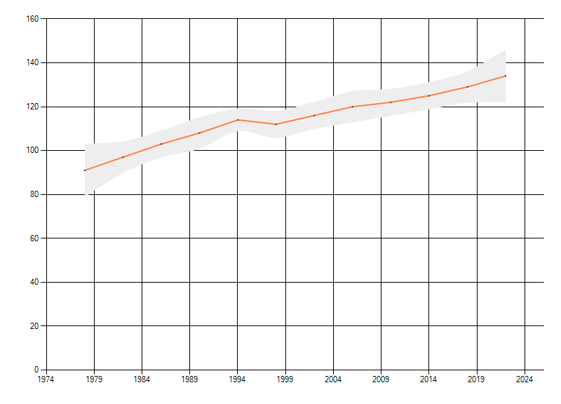 Gemiddelde trend van het aantal kilometerhokken waarin de soort voorkomt, weergegeven als indexcijfer (1975-1978 = 100).