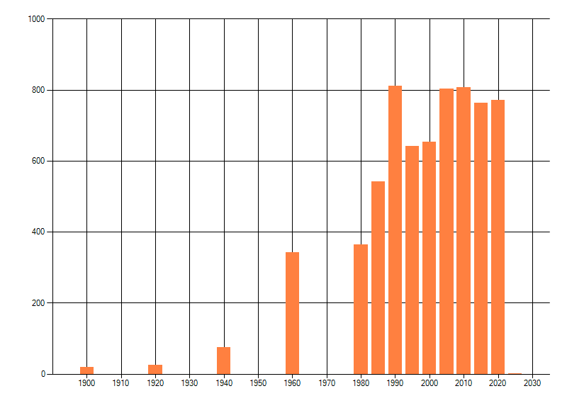 Het aantal atlasblokken (5x5 km) waarin de soort is gemeld binnen een periode van vijf jaar (vanaf 1980) of twintig jaar. Niet gecorrigeerd voor waarnemersinspanning en het aantal doorgegeven waarnemingen kan sterk variëren per periode, dus een trend in verspreiding kan hier niet direct uit worden afgelezen. Het opgegeven jaartal is het eerste jaar van de periode. Bron: gevalideerde waarnemingen uit de NDFF.