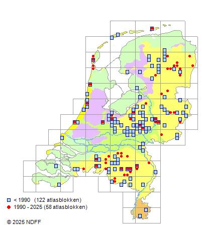 Het aantal atlasblokken (5x5 km) waarin de soort is gemeld binnen een periode van vijf jaar (vanaf 1980) of twintig jaar. Niet gecorrigeerd voor waarnemersinspanning en het aantal doorgegeven waarnemingen kan sterk variëren per periode, dus een trend in verspreiding kan hier niet direct uit worden afgelezen. Het opgegeven jaartal is het eerste jaar van de periode. Bron: gevalideerde waarnemingen uit de NDFF.
