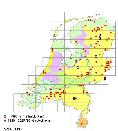 Het aantal atlasblokken (5x5 km) waarin de soort is gemeld binnen een periode van vijf jaar (vanaf 1980) of twintig jaar. Niet gecorrigeerd voor waarnemersinspanning en het aantal doorgegeven waarnemingen kan sterk variëren per periode, dus een trend in verspreiding kan hier niet direct uit worden afgelezen. Het opgegeven jaartal is het eerste jaar van de periode. Bron: gevalideerde waarnemingen uit de NDFF.