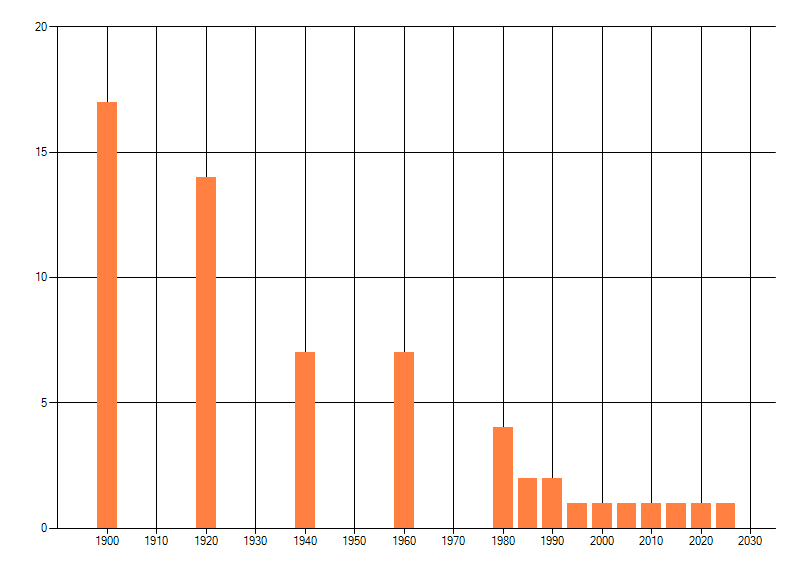 Het aantal atlasblokken (5x5 km) waarin de soort is gemeld binnen een periode van vijf jaar (vanaf 1980) of twintig jaar. Niet gecorrigeerd voor waarnemersinspanning en het aantal doorgegeven waarnemingen kan sterk variëren per periode, dus een trend in verspreiding kan hier niet direct uit worden afgelezen. Het opgegeven jaartal is het eerste jaar van de periode. Bron: gevalideerde waarnemingen uit de NDFF.