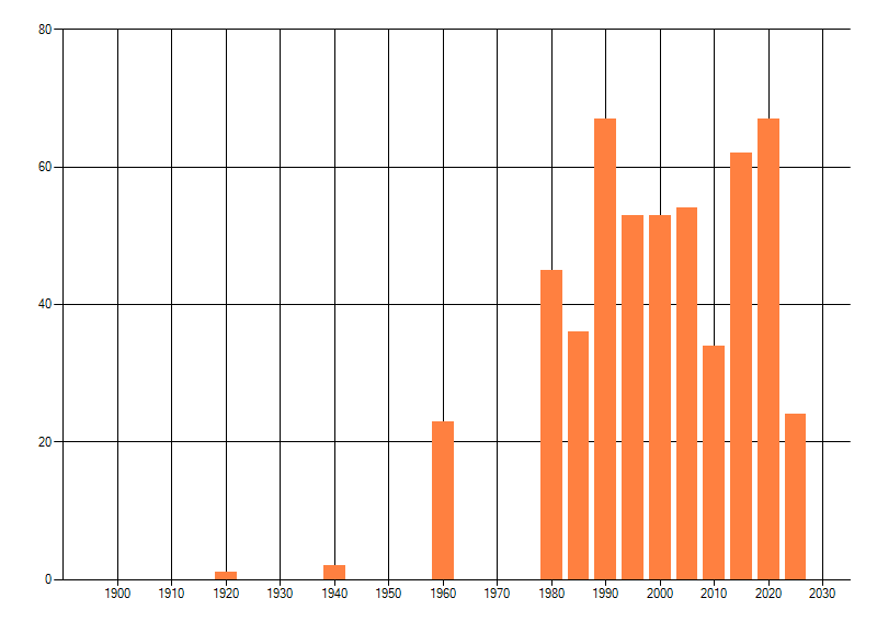 Het aantal atlasblokken (5x5 km) waarin de soort is gemeld binnen een periode van vijf jaar (vanaf 1980) of twintig jaar. Niet gecorrigeerd voor waarnemersinspanning en het aantal doorgegeven waarnemingen kan sterk variëren per periode, dus een trend in verspreiding kan hier niet direct uit worden afgelezen. Het opgegeven jaartal is het eerste jaar van de periode. Bron: gevalideerde waarnemingen uit de NDFF.