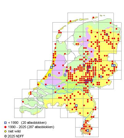 Het aantal atlasblokken (5x5 km) waarin de soort is gemeld binnen een periode van vijf jaar (vanaf 1980) of twintig jaar. Niet gecorrigeerd voor waarnemersinspanning en het aantal doorgegeven waarnemingen kan sterk variëren per periode, dus een trend in verspreiding kan hier niet direct uit worden afgelezen. Het opgegeven jaartal is het eerste jaar van de periode. Bron: gevalideerde waarnemingen uit de NDFF.