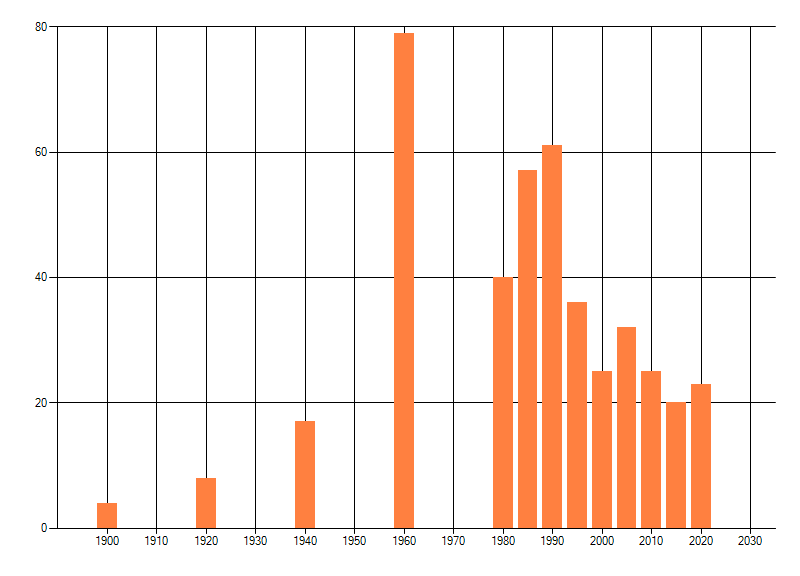 Het aantal atlasblokken (5x5 km) waarin de soort is gemeld binnen een periode van vijf jaar (vanaf 1980) of twintig jaar. Niet gecorrigeerd voor waarnemersinspanning en het aantal doorgegeven waarnemingen kan sterk variëren per periode, dus een trend in verspreiding kan hier niet direct uit worden afgelezen. Het opgegeven jaartal is het eerste jaar van de periode. Bron: gevalideerde waarnemingen uit de NDFF.