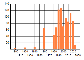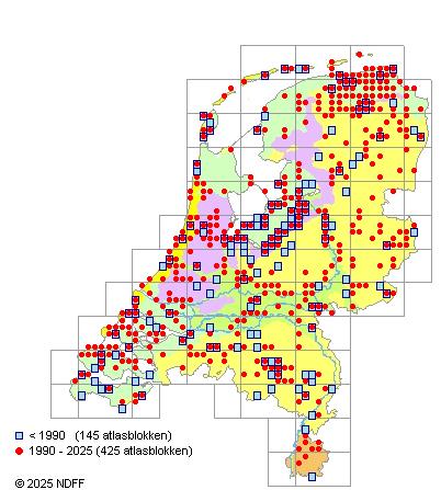 Het aantal atlasblokken (5x5 km) waarin de soort is gemeld binnen een periode van vijf jaar (vanaf 1980) of twintig jaar. Niet gecorrigeerd voor waarnemersinspanning en het aantal doorgegeven waarnemingen kan sterk variëren per periode, dus een trend in verspreiding kan hier niet direct uit worden afgelezen. Het opgegeven jaartal is het eerste jaar van de periode. Bron: gevalideerde waarnemingen uit de NDFF.