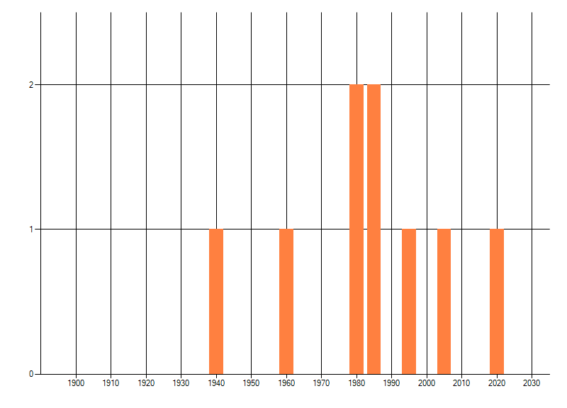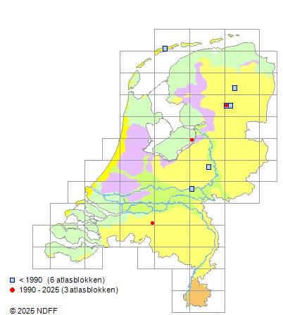 Het aantal atlasblokken (5x5 km) waarin de soort is gemeld binnen een periode van vijf jaar (vanaf 1980) of twintig jaar. Niet gecorrigeerd voor waarnemersinspanning en het aantal doorgegeven waarnemingen kan sterk variëren per periode, dus een trend in verspreiding kan hier niet direct uit worden afgelezen. Het opgegeven jaartal is het eerste jaar van de periode. Bron: gevalideerde waarnemingen uit de NDFF.