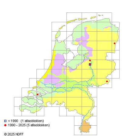 Het aantal atlasblokken (5x5 km) waarin de soort is gemeld binnen een periode van vijf jaar (vanaf 1980) of twintig jaar. Niet gecorrigeerd voor waarnemersinspanning en het aantal doorgegeven waarnemingen kan sterk variëren per periode, dus een trend in verspreiding kan hier niet direct uit worden afgelezen. Het opgegeven jaartal is het eerste jaar van de periode. Bron: gevalideerde waarnemingen uit de NDFF.