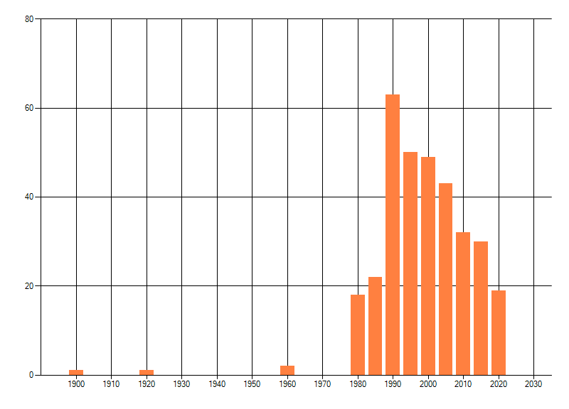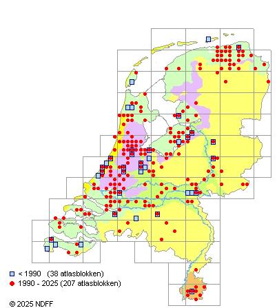 Het aantal atlasblokken (5x5 km) waarin de soort is gemeld binnen een periode van vijf jaar (vanaf 1980) of twintig jaar. Niet gecorrigeerd voor waarnemersinspanning en het aantal doorgegeven waarnemingen kan sterk variëren per periode, dus een trend in verspreiding kan hier niet direct uit worden afgelezen. Het opgegeven jaartal is het eerste jaar van de periode. Bron: gevalideerde waarnemingen uit de NDFF.