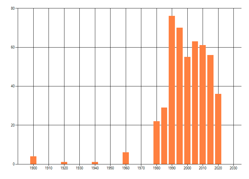 Het aantal atlasblokken (5x5 km) waarin de soort is gemeld binnen een periode van vijf jaar (vanaf 1980) of twintig jaar. Niet gecorrigeerd voor waarnemersinspanning en het aantal doorgegeven waarnemingen kan sterk variëren per periode, dus een trend in verspreiding kan hier niet direct uit worden afgelezen. Het opgegeven jaartal is het eerste jaar van de periode. Bron: gevalideerde waarnemingen uit de NDFF.