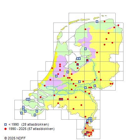 Het aantal atlasblokken (5x5 km) waarin de soort is gemeld binnen een periode van vijf jaar (vanaf 1980) of twintig jaar. Niet gecorrigeerd voor waarnemersinspanning en het aantal doorgegeven waarnemingen kan sterk variëren per periode, dus een trend in verspreiding kan hier niet direct uit worden afgelezen. Het opgegeven jaartal is het eerste jaar van de periode. Bron: gevalideerde waarnemingen uit de NDFF.