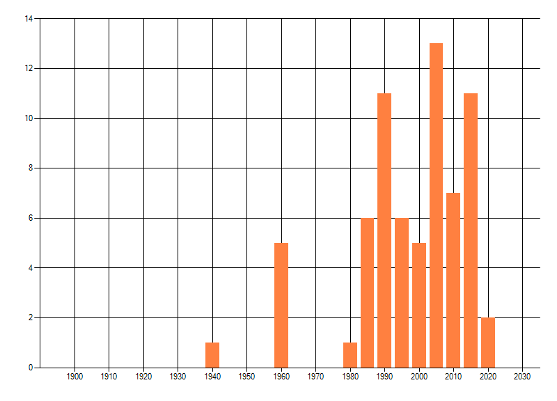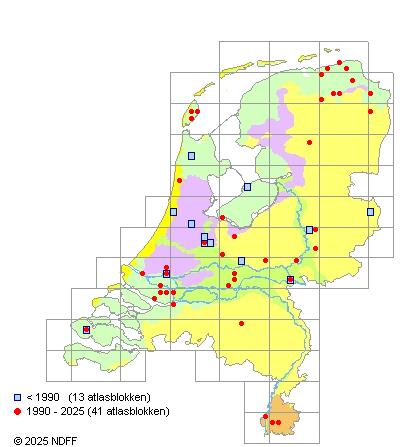 Het aantal atlasblokken (5x5 km) waarin de soort is gemeld binnen een periode van vijf jaar (vanaf 1980) of twintig jaar. Niet gecorrigeerd voor waarnemersinspanning en het aantal doorgegeven waarnemingen kan sterk variëren per periode, dus een trend in verspreiding kan hier niet direct uit worden afgelezen. Het opgegeven jaartal is het eerste jaar van de periode. Bron: gevalideerde waarnemingen uit de NDFF.