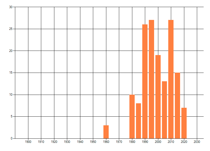 Het aantal atlasblokken (5x5 km) waarin de soort is gemeld binnen een periode van vijf jaar (vanaf 1980) of twintig jaar. Niet gecorrigeerd voor waarnemersinspanning en het aantal doorgegeven waarnemingen kan sterk variëren per periode, dus een trend in verspreiding kan hier niet direct uit worden afgelezen. Het opgegeven jaartal is het eerste jaar van de periode. Bron: gevalideerde waarnemingen uit de NDFF.