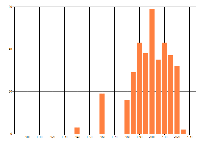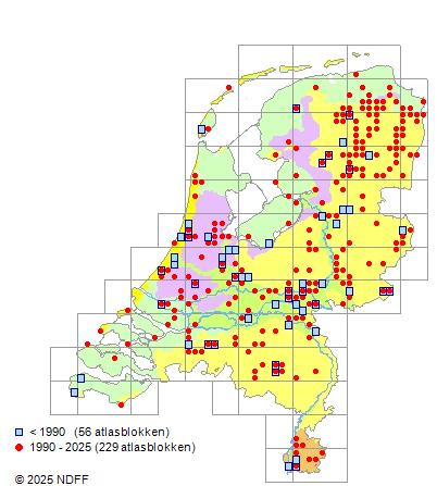 Het aantal atlasblokken (5x5 km) waarin de soort is gemeld binnen een periode van vijf jaar (vanaf 1980) of twintig jaar. Niet gecorrigeerd voor waarnemersinspanning en het aantal doorgegeven waarnemingen kan sterk variëren per periode, dus een trend in verspreiding kan hier niet direct uit worden afgelezen. Het opgegeven jaartal is het eerste jaar van de periode. Bron: gevalideerde waarnemingen uit de NDFF.