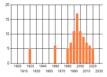 Het aantal atlasblokken (5x5 km) waarin de soort is gemeld binnen een periode van vijf jaar (vanaf 1980) of twintig jaar. Niet gecorrigeerd voor waarnemersinspanning en het aantal doorgegeven waarnemingen kan sterk variëren per periode, dus een trend in verspreiding kan hier niet direct uit worden afgelezen. Het opgegeven jaartal is het eerste jaar van de periode. Bron: gevalideerde waarnemingen uit de NDFF.