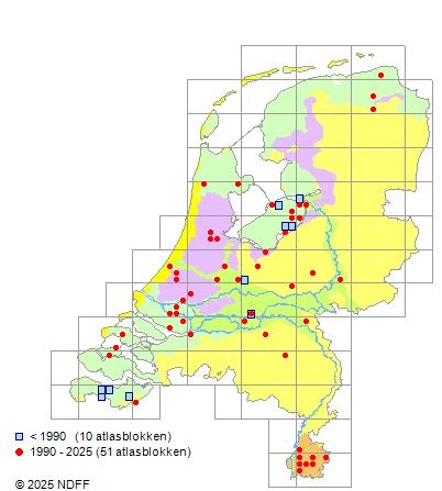 Het aantal atlasblokken (5x5 km) waarin de soort is gemeld binnen een periode van vijf jaar (vanaf 1980) of twintig jaar. Niet gecorrigeerd voor waarnemersinspanning en het aantal doorgegeven waarnemingen kan sterk variëren per periode, dus een trend in verspreiding kan hier niet direct uit worden afgelezen. Het opgegeven jaartal is het eerste jaar van de periode. Bron: gevalideerde waarnemingen uit de NDFF.